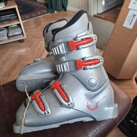 Alpina pjäxor i svart med röda och grå detaljer. Modellen har fyra justerbara spännen framtill och kraftig sula med rött greppmönster. Skaftet är vadderat upptill för ökad komfort och har mönstrad manschett runt vristen. Passar för alpin skidåkning med standard alpina bindningar. Storlek och exakta tekniska specifikationer är inte angivna.Storlek 24