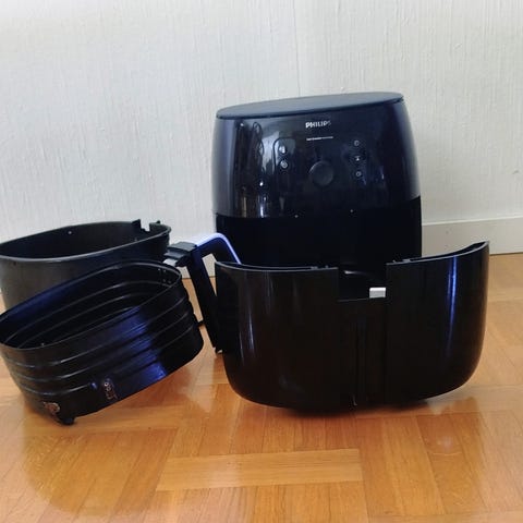 Philips airfryer i svart utförande. Elektrisk varmluftsfritös som används för tillagning av mat med hjälp av cirkulerande varmluft. Utrustad med utdragbar korg framtill. Passar för fritering, uppvärmning och tillagning av olika typer av livsmedel i hemmet. Drivs med nätström via vanlig väggkontakt.