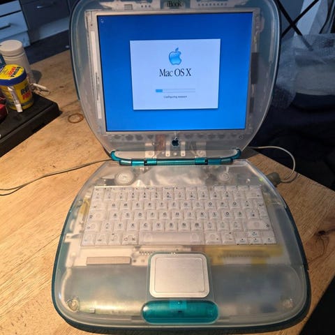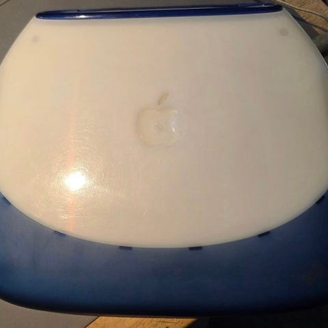 Det är en iBook från Apple med Mac OS X installerat (version 10.3.9). 366 MHz PowerPC G3 processor och 320 MB minne. Den är numera tämligen stationär då batteriet inte längre kan laddas. Efter att laddporten började gnistra och spraka ordnade min pappa en svans på den, inte så vacker men den funkar. En spricka finns inuti i närheten av enterknappen. Undersidan samt laddosan är repad.