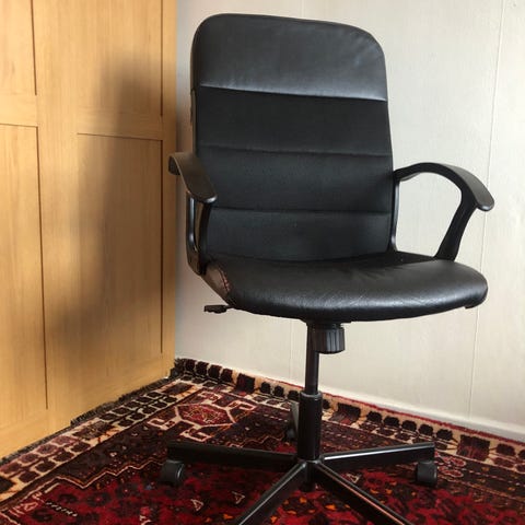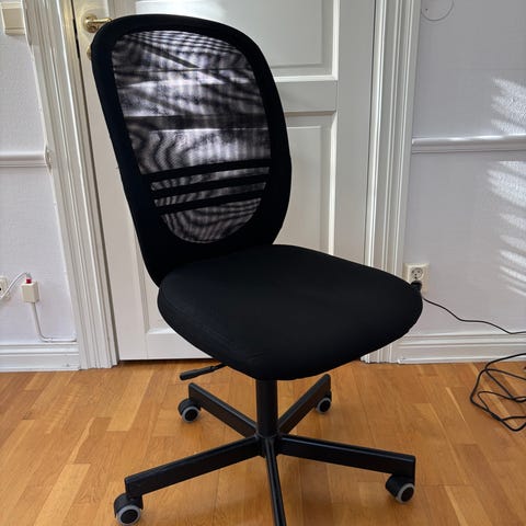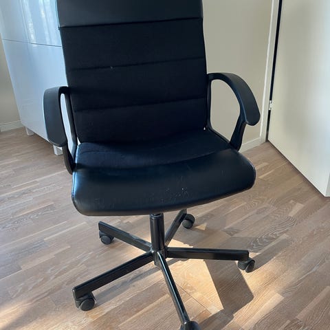 Skrivbordsstol i konstläder från IKEA i modellen ”TORKEL”. Sliten framtill på sitsen (se bild), annars i bra skick. Säljs inte längre i butik.