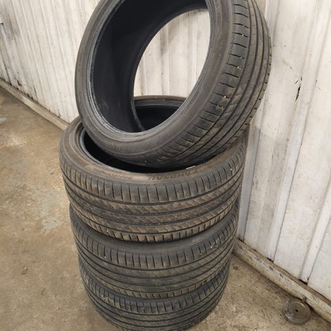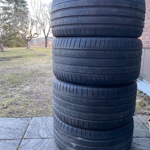 Jämnt slitna, ca 3-4mm kvar, rullar lätt en säsong till.