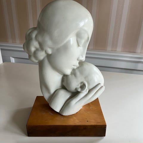 Vit skulptur föreställande en pojke och en hund som sitter mittemot varandra på en oval sockel. Figuren är utförd i ett ljust material, troligen gips. Motivets detaljer visar barnets och hundens ansiktsuttryck samt päls- och klädfall. Passar som prydnadsföremål i exempelvis vardagsrum eller hall, på hylla, byrå eller sideboard. Hämtas i Väckelsång.