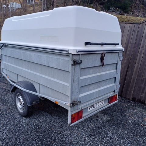 Släpvagn med vit kåpa och grå galvaniserad flaklåda. Enaxlat släp med dragkrok framtill och öppningsbar baklucka med lås. Kåpan är uppfällbar för enkel lastning och lossning. Utrustad med bakljus och reflexer. Lämplig för transport av exempelvis byggmaterial, trädgårdsavfall eller annan last som behöver skyddas mot väder.