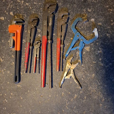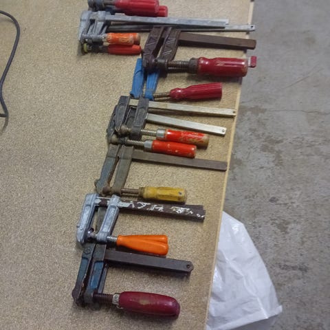 Säljer ett paket med låstång och svetstvingar i olika storlekar och utföranden.
