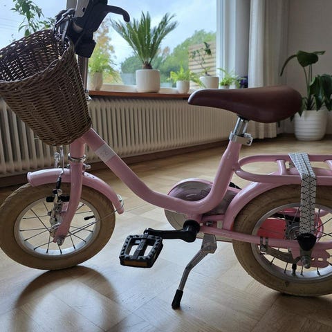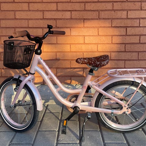 Monark lill-karin barncykel med 16" hjul i rosa färg. Cykeln har lågt insteg, kedjeskydd, pakethållare bak och korg fram. Nyservad. Utrustad med fotbroms bak och handbroms fram.
