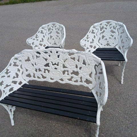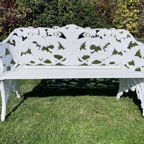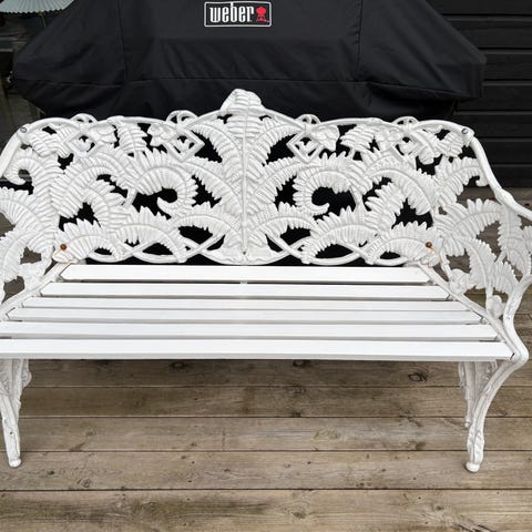 Trädgårdsbänk, vitmåladmed dekorativt mönstrad rygg och sidor i gjuten aluminium .Sitsen består av träbrädor i mörkare ton. Bänken är avsedd för utomhusbruk, exempelvis i trädgård, på altan eller uteplats. Konstruktionen är stabil, tung, med ben, armstöd och ryggstöd gjuten aluminium.