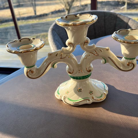 Rosa Ljung ljusstake och prydnadsfigurer i keramik. Setet består av en vit flerarmad ljusstake samt mindre prydnadsföremål i vit keramik med dekormålning. Passar som inredningsdetaljer på bord, hylla eller fönsterbräda.