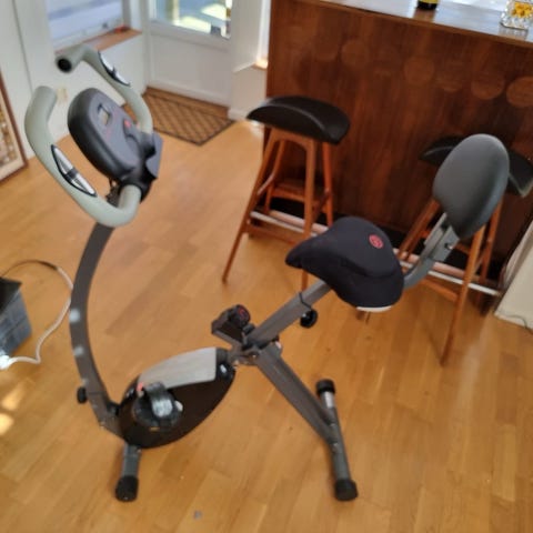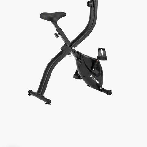 Motionscykel i hopfällbar modell i svart färg. Cykeln har sadel med justerbar höjd och pedaler med remmar för bättre fotfäste. Konstruktionen är kompakt och utformad för hemmaträning och kan fällas ihop för enklare förvaring när den inte används.