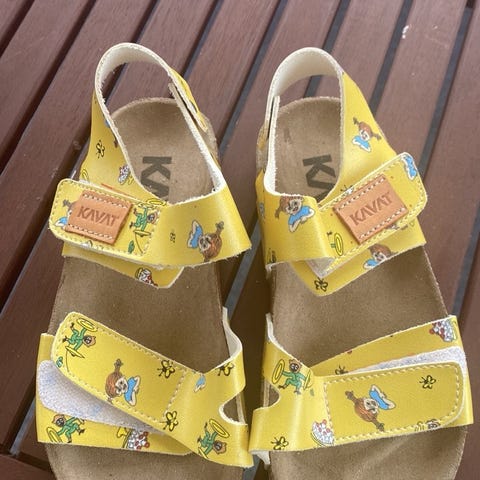 Barn sandaler för flicka i storlek 27, innermått ca17.4 cm. Sandalerna har en mönstrad sula med havstema i grönt och rosa färger. Remmarna är rosa och justerbara för att passa foten. Sulan är svart med mönster för bättre grepp. Passar för vardagligt bruk under varmare väder.