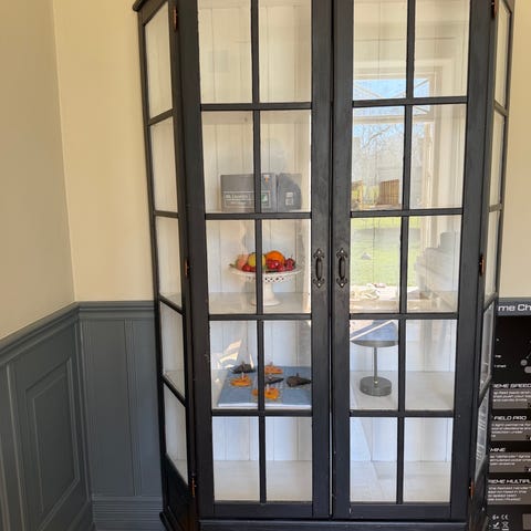 Vackert vitrinskåp / bokskåp från 30-talet. Skåpet är renoverat och ommålat i mörkblå kalkfärg som sedan vaxats, vilket ger en mer levande yta. Säljes pga flytt.