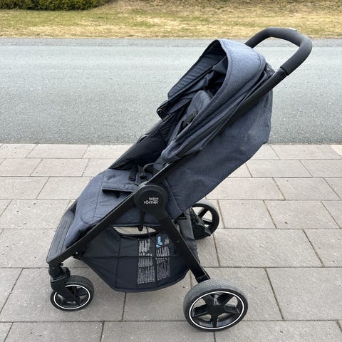 Britax barnvagn i grått och svart med sittdel. Vagnen har justerbart handtag, sufflett och sele i sittdelen. Framhjulen är svängbara och bakhjulen är större för stabilitet. Under vagnen finns en varukorg för förvaring. Passar ett barn som kan sitta upp, för vardagsbruk och promenader i stadsmiljö.