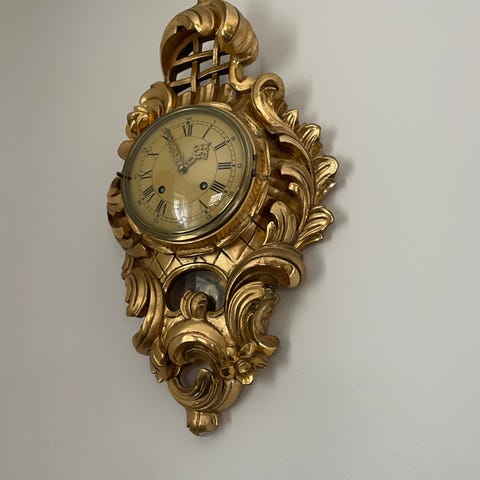 Äldre set med VÄGGKLOCKA plus VÄGGLAMPA / ROKOKO-stil / TRÄ, gyllene färg