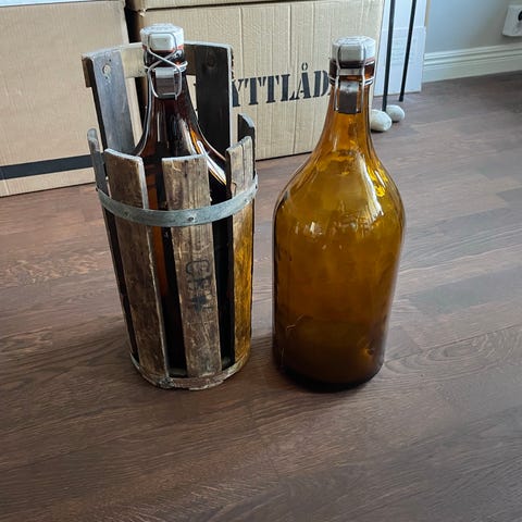 Gammal flaska, fint skick, med träställning, ok beg skick, ålderstecken ställningen. . STOR flaska, 45cm, vet inte hur många liter. HÄMTAS Helsingborg, Pålsjö Östra
