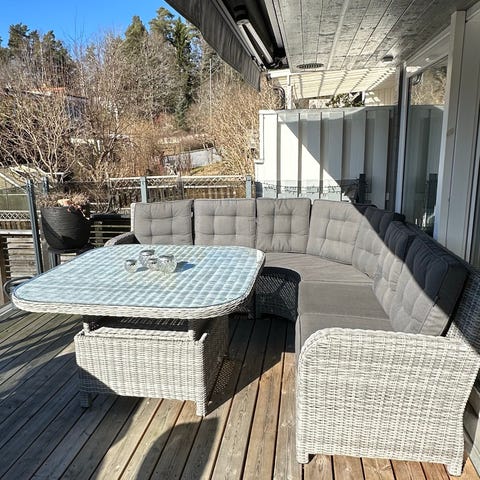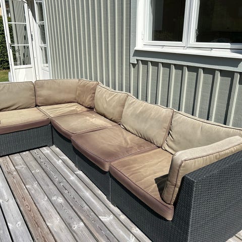 Hörngrupp för utebruk med grå dynor. Består av flera moduler som kan ställas som hörnsoffa eller separata sittdelar. Stomme i aluminium . Använd 2 somrar. God kvalité. 254/197 höjd 92