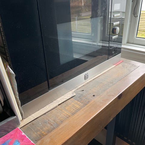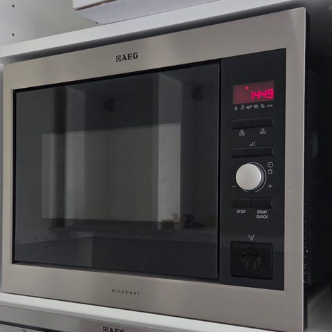 Front i rostfritt stål med svart glaslucka. Inbyggd modell avsedd för montering i köksskåp. Kontrollpanel och display sitter på sidan av luckan.