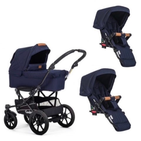 Stabil men ändå smidig vagn med liggdel, sittdel, ståbräda och regnskydd (som passar både till ligg- och sittdelen). Vi har köpt till outdoor däck som är de som är på på bilderna. Dessa har varit super i slask och snö. Orginaldäcken är bäst när det är barmark, och däcken är lätta att byta.
