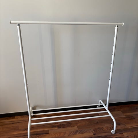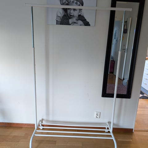 En vit klädstång med en hylla för skor/lådor. Lite svajigt, men fungerar väl :)