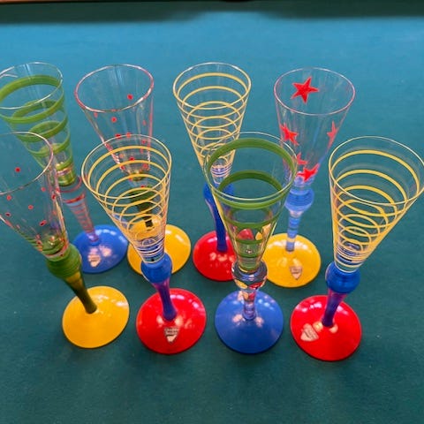 Orrefors clown glas, champagneglas med konformad kupa och färgade ben och fötter i olika mönster. Glasen är genomskinliga med dekormålning i flera färger på kupa och fot.