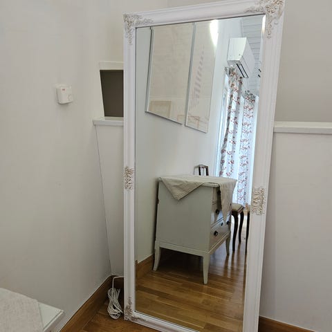 Spegel med helkroppsformat och vit ram. Rektangulär modell som kan användas som golvspegel eller väggspegel i exempelvis hall, sovrum eller klädkammare. Vit profilerad ram i trä- eller träimitation ger en enkel och neutral stil som passar i de flesta inredningar.
