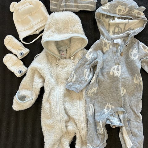 Båda sparsamt använda men finns en liten fläck på ena tummen och lite nopper på mössan. Tunn modell som är kanon till höst/vår eller som underlager vintertid. Båda strl 86/92