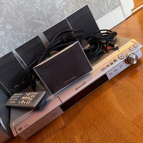 Panasonic hemmabiosystem i svart utförande. Systemet består av flera högtalare på stativ, en centerhögtalare, en subwoofer samt en huvuddel med anslutningar och medföljande kablar. Lämpligt för användning tillsammans med tv eller annan ljudkälla för flerkanalsljud i hemmamiljö.