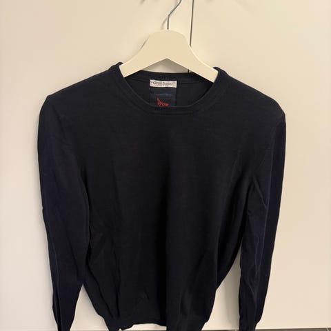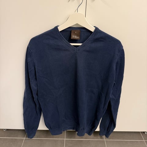 Oscar Jacobson V-ringad herrtröja i storlek L. Tröjan är blå och tillverkad i bomull. Långärmad modell med ribbade muddar och nederkant. Passar som vardags- eller kontorsplagg samt som lager under jacka eller kavaj.