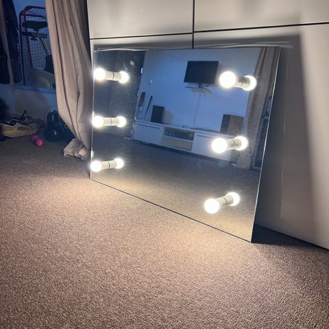 Sminkspegel från Claes Ohlson med LED-lampor. Spegeln kan hängas på väggen eller placeras stående med hjälp av stödet som finns på baksidan. 3 meter lång sladd med dimmer och nätadapter. Höjd 55 cm, bredd 45 cm.