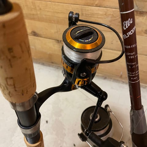 Fiskespön med monterade haspelrullar. Flera spön i olika längder syns på bilden, samtliga med rullfästen och handtag. Passar för allroundfiske från land eller båt beroende på längd och kastvikt. Material och exakta mått framgår inte, men spöna är försedda med ringar längs klingan och rullarna har vev och lina monterad. Säljs som utrustning för sport- och fritidsfiske.