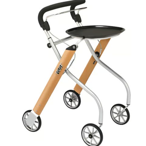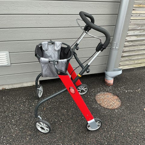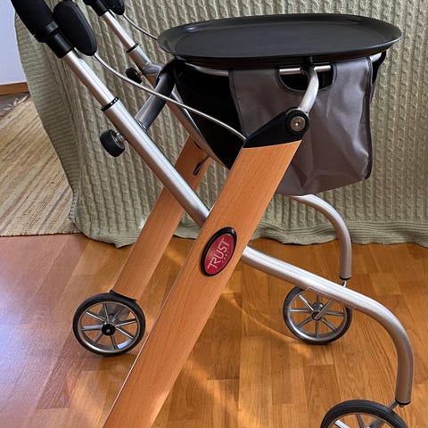 Lätt och smidig inomhusrollator med bricka och praktisk påse för småsaker. Fin och fräsch.