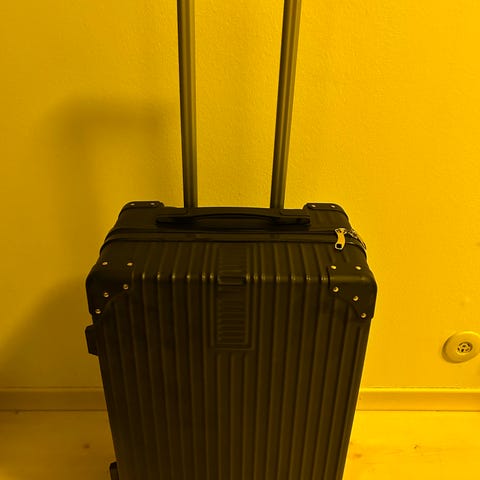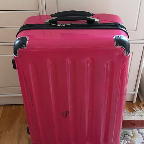 Resväska i storlek 56x36x26 cm, med hjulen inräknat. Har använts några gånger, men är fullt funktionell. Hjulen har bromsar och det ingår 2 nycklar.