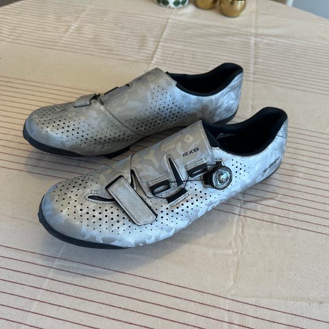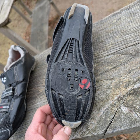 Bontrager cykelskor i storlek 46. Skorna är svarta med vita detaljer och har flera kardborreband samt ett spänne för justerbar passform. Avsedda för användning med cykelpedaler som kräver cykelskor med styv sula och fästen för klossar. Passar för landsvägscykling eller liknande användning där stadiga cykelskor behövs.