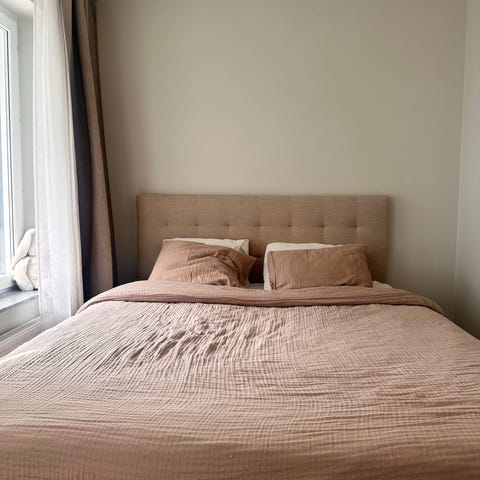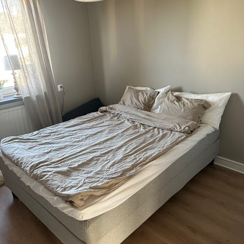 Queen size säng med stoppad beige sänggavel