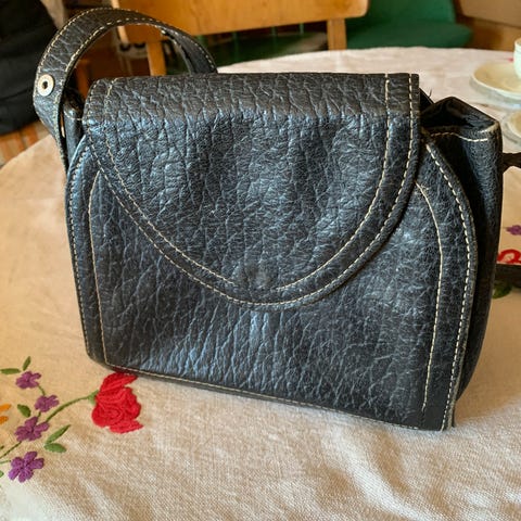 Väska av 50-talsmodell med bruksslitage.L 38 cm,H 34 cm,B 20 cm,ett innerfack