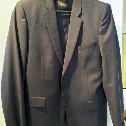Svart kostym med mönster. Kommer med väst och byxor. Storlek M på kavajen, västen och byxorna.