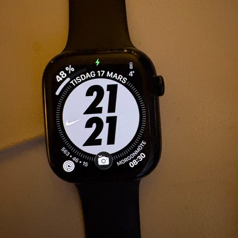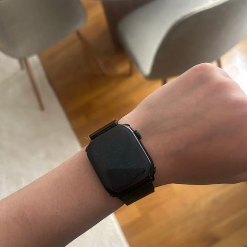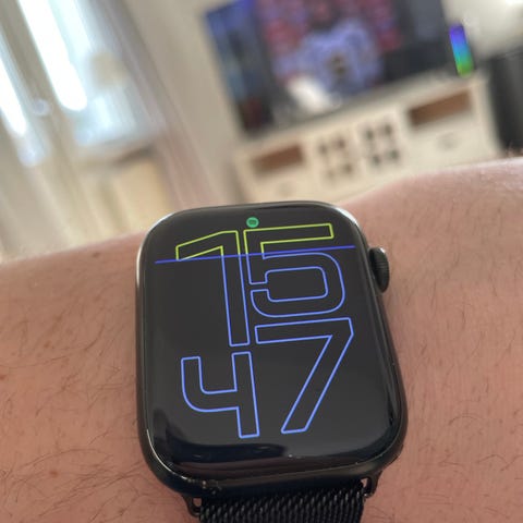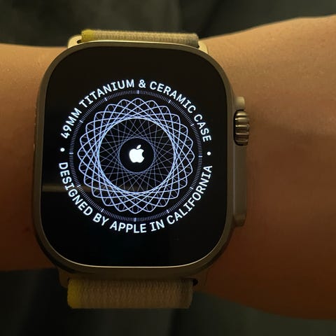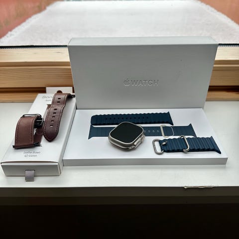 Apple Watch Ultra smartklocka i svart utförande. Digital armbandsklocka med upplyst urtavla och tydliga siffror. Klockan har pekskärm och bärs med svart armband. Lämplig för vardagsbruk och träning, med funktioner som tidtagning och aktivitetsmätning beroende på konfiguration och appar.