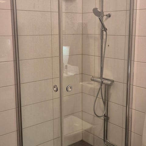 Rundade duschdörrar i gott skick säljes i samband med badrumsrenovering.