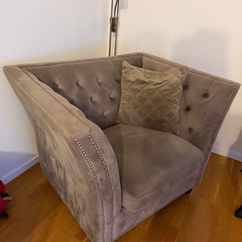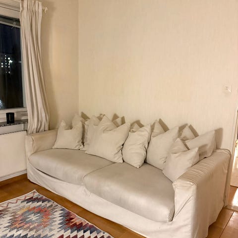 Har tvättats nyligen och ser hel och ren ut. Kan finnas spår av fläckar som inte gått bort men ser inget uppenbart, lite noppor i tyget bara.