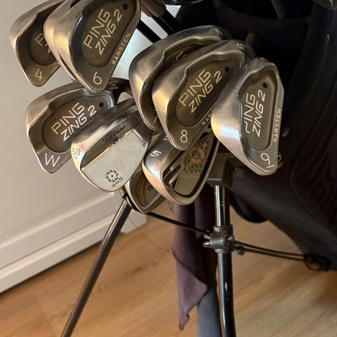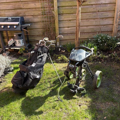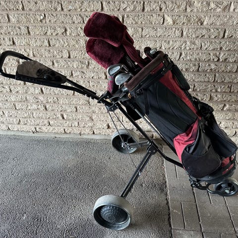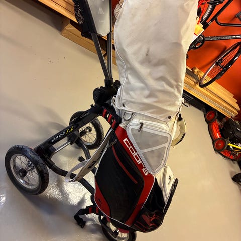 Wilson golfset med vagn i röd och svart/vit färg. Setet består av en golfbag monterad på en trehjulig golfvagn med handtag och hållare för tillbehör. Golfbagen har flera fickor för förvaring av bollar, peggar och andra småsaker samt dragkedjefickor på sidorna. Det finns även ett regnöverdrag till bagen. Passar för golfspelare som vill ha ett komplett set med bag och vagn för användning på golfbanan.