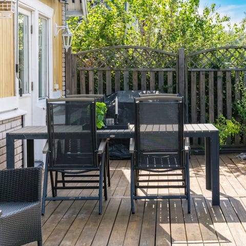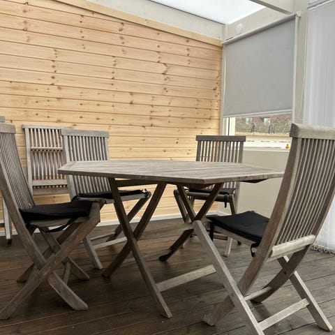 Turin cafégrupp i trä från Brafab med ett runt 80 cm och 4st stolar. Både stolar och bord är ihopfällbara och lätta att förvara när de inte används.