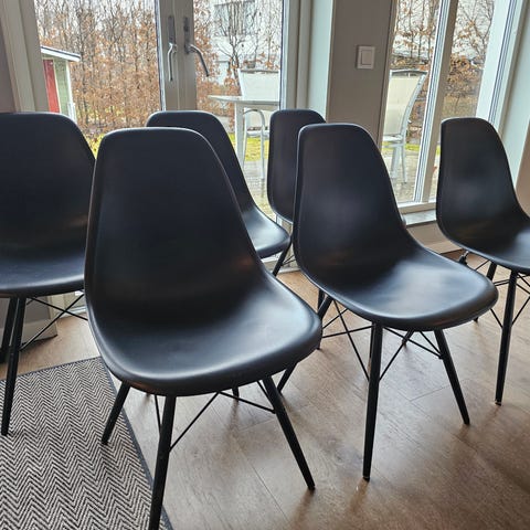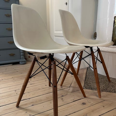 Fyra klassiska äkta vita Eames plastic chair DSW Golden Maple, köpta på 00-talet på Nordiska Galleriet letar nytt hem. Nypris ca 5200 st. Bra bruksskick, men lite skavmärken längst ner på benen tex.