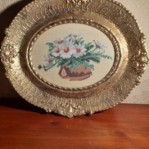 Handbroderad tavla med en ros