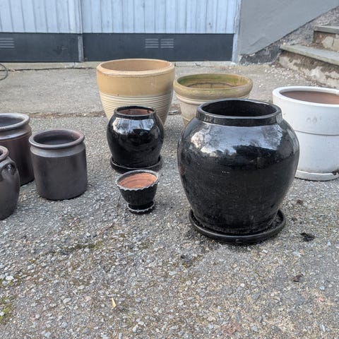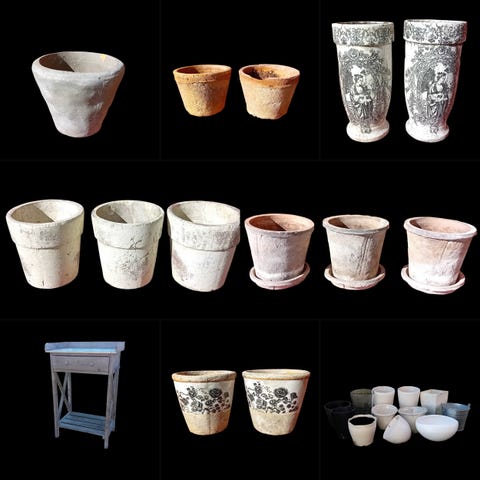 Krukor i blandade modeller, stora och små storlekar, för utomhusbruk. Material Terrakotta, Betong, Sten, Fibercement, Keramik och Stenliknande komposit. Flera olika former förekommer, bland annat fyrkantiga, runda och koniska krukor.
