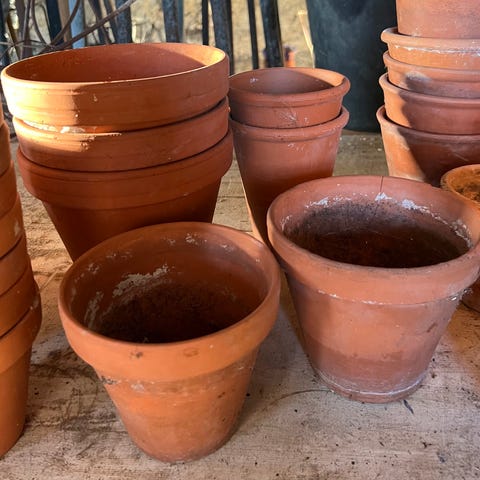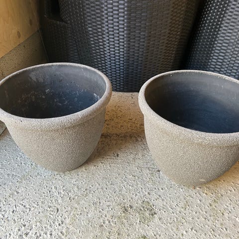 Various sizes of plant pots in both plastic and ceramic/terracotta. Most have plant saucers included.