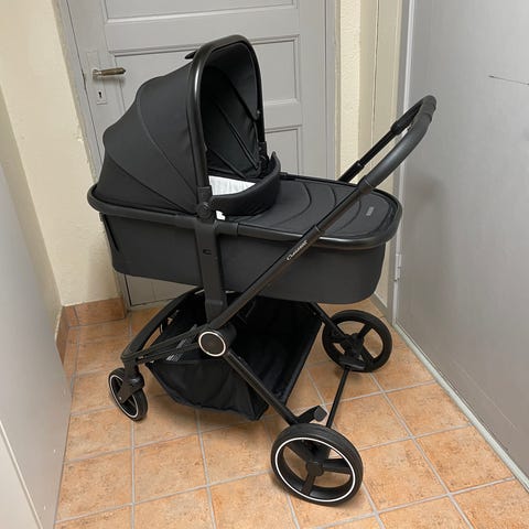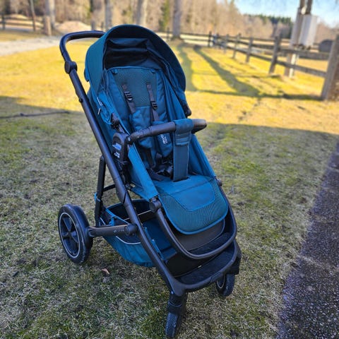 Vagnen har justerbart ryggstöd, sufflett och fotstöd samt vadderad sittdel. Åkpåse, fodrad vinteråkpåse, separat liggdel (i princip oanvänd), skötväska, regnskydd och insektsnät ingår.