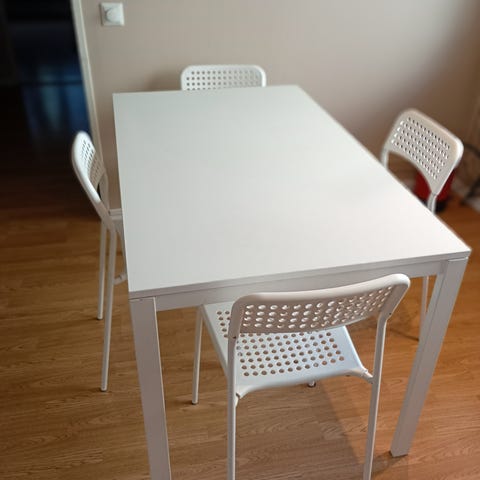 Matbord med fyrkantig träfärgad bordsskiva och svart metallstativ. Till bordet hör fyra stolar med svart klädsel och höga ryggstöd. Passar som matgrupp i kök eller mindre matplats.