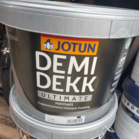 Jotun Demidekk Ultimate täckfärg A-bas. Opaque utomhusfärg avsedd för träskydd och målning av träytor utomhus. Burken är märkt med A-bas, vilket innebär att färgen bryts till önskad kulör i butik innan användning.