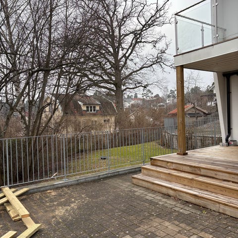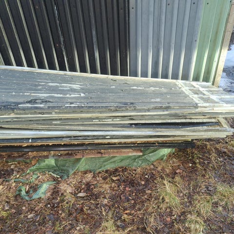 Träräcken i flera sektioner, målade. Lämpliga som altanräcke, balkongräcke eller avskärmning i trädgård eller vid uteplats. Ca nio meter plus lite trappsektioner.