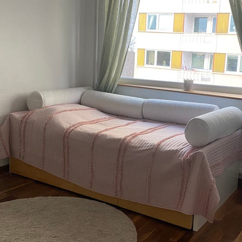 En praktiskt säng med Ikea Sultan madrass med trästomme och lådor för förvaring som behöver skänkas till ett nytt hem
