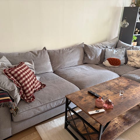 Mio hörnsoffa i grått tyg. Soffan har schäslongdel och flera sittplatser i vinkel, vilket ger gott om utrymme för flera personer. Klädseln är i vävt tyg och soffan har raka armstöd och ryggstöd med lösa ryggkuddar. Passar som större sofflösning i vardagsrum eller allrum.