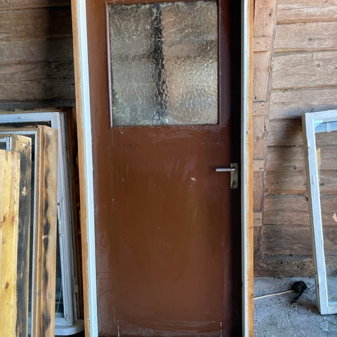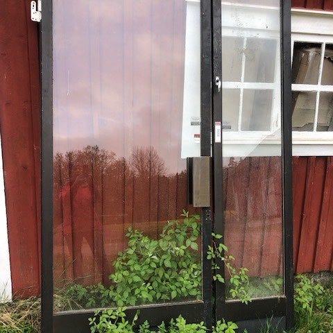 Glasskärmtak för ytterdörr. Taket består av en plan glasskiva som är monterad med metalskena i underkant och stagad med stålpinnar mot fasaden. Konstruktionen är avsedd att ge skydd över entrédörren mot regn och snö samtidigt som den släpper igenom ljus. Passar montering på yttervägg ovanför dörr eller annan entré där ett diskret och modernt tak önskas. Monteras enligt bilderna.